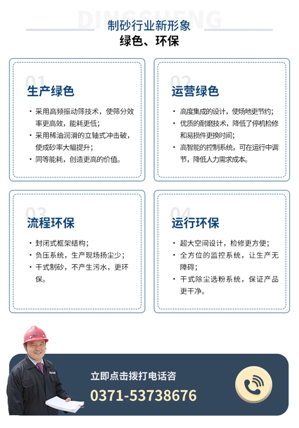 對(duì)于利于環(huán)保, 傳統(tǒng)的濕法生產(chǎn)線生產(chǎn)過程需大量水對(duì)砂進(jìn)行清洗, 從一定角度來講對(duì) 于水資源是一種浪費(fèi),并且對(duì)于在生產(chǎn)過程中產(chǎn)生的石粉的沖洗也是對(duì)礦產(chǎn)資源的一種浪 費(fèi)。而干法則正好避免了這些, 所以從某種程度上節(jié)約了水資源和礦產(chǎn)資源, 比濕法生產(chǎn)線 更加環(huán)保。