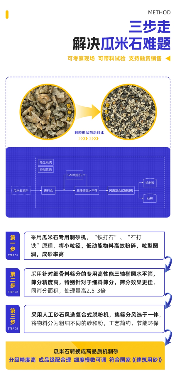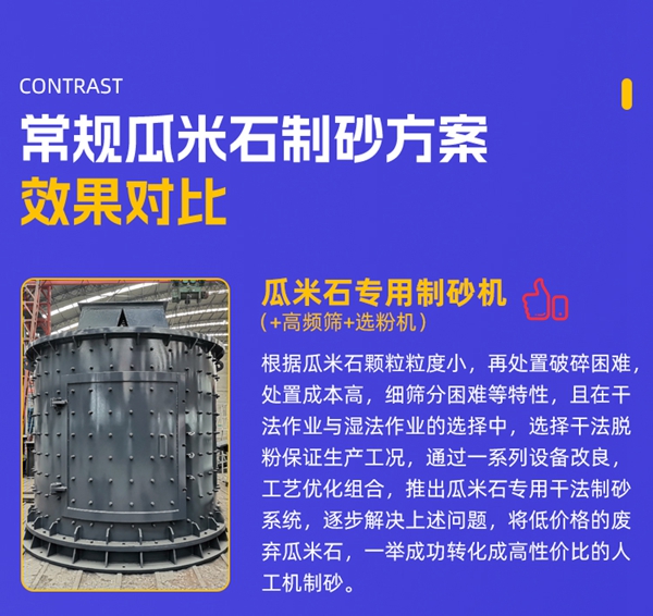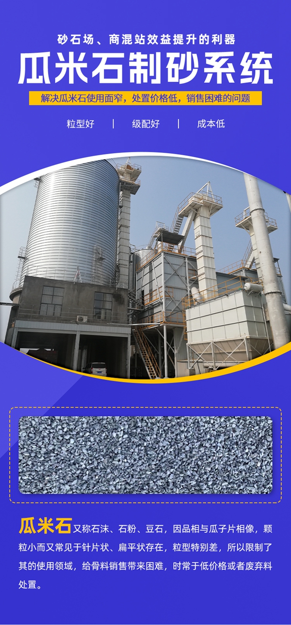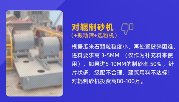 根據(jù)瓜米石顆粒粒度小,再處置破碎困難,進料要求高3-5MM(僅作為補充料來使用),如果進5-10MM的制砂率50%,針片狀多,級配不合理,建筑用料不達標,對輥制砂機投資高80-100萬。