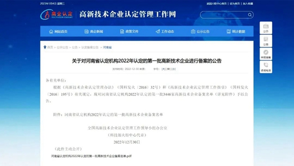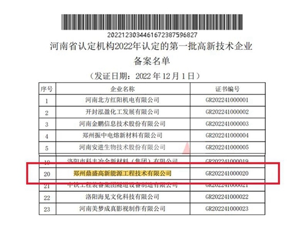 2022年12月30日,全國(guó)高新技術(shù)企業(yè)認(rèn)定管理工作領(lǐng)導(dǎo)小組辦公室,公布了《河南省認(rèn)定機(jī)構(gòu)2022年認(rèn)定的第一批高新技術(shù)企業(yè)備案公告名單》。鄭州鼎盛高新能源工程技術(shù)有限公司(以下簡(jiǎn)稱“鄭州鼎盛”)名列其中,順利通過“國(guó)家高新技術(shù)企業(yè)”復(fù)審認(rèn)定。