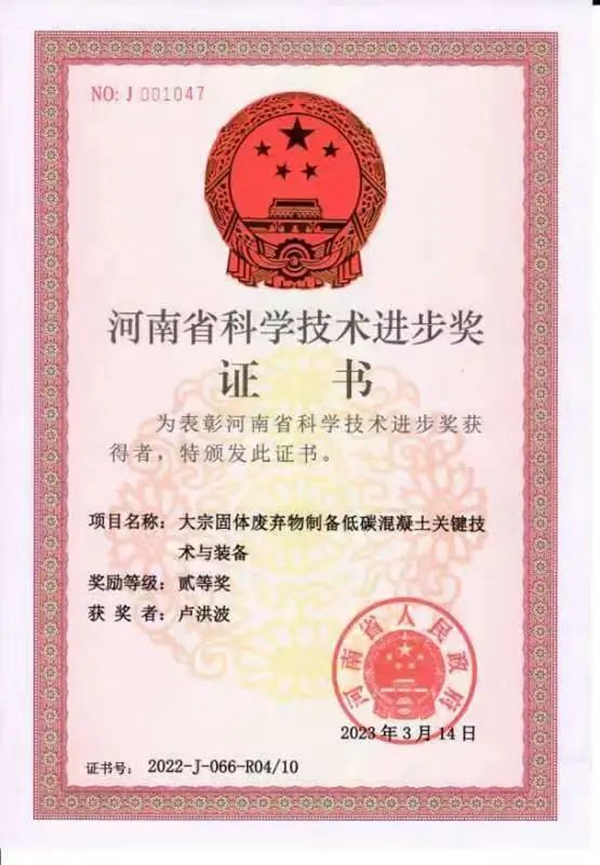 3月24日,河南省人民政府發(fā)布《關(guān)于2022年度河南省科學(xué)技術(shù)獎(jiǎng)勵(lì)的決定》。根據(jù)《河南省科學(xué)技術(shù)獎(jiǎng)勵(lì)辦法》(省政府令第57號(hào))規(guī)定,經(jīng)省政府常務(wù)會(huì)議審議,特別對(duì)2022年度河南省科學(xué)技術(shù)杰出貢獻(xiàn)獎(jiǎng)、河南省自然科學(xué)獎(jiǎng)、河南省技術(shù)發(fā)明獎(jiǎng)、河南省科學(xué)技術(shù)進(jìn)步獎(jiǎng)等進(jìn)行表彰獎(jiǎng)勵(lì)。其中由鄭州鼎盛聯(lián)合華北水利水電大學(xué)、中建七局第四建筑有限公司共同完成的“大宗固體廢棄物制備低碳混凝土關(guān)鍵技術(shù)與裝備”項(xiàng)目,喜獲河南省科學(xué)技術(shù)進(jìn)步二等獎(jiǎng),填補(bǔ)了鄭州鼎盛在該領(lǐng)域內(nèi)的空白,為公司在技術(shù)創(chuàng)新領(lǐng)域開創(chuàng)新局面。
