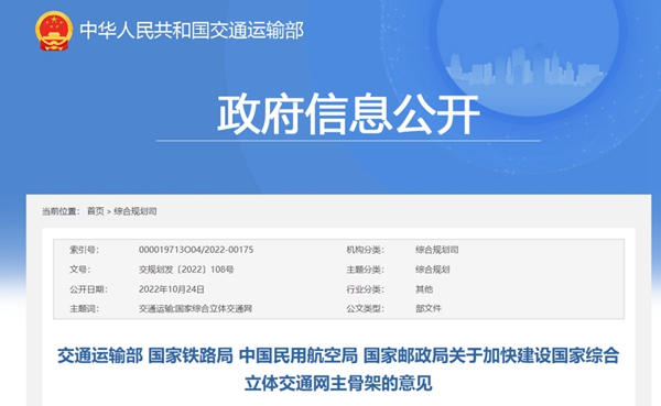 交通運(yùn)輸部 國家鐵路局 中國民用航空局 國家郵政局關(guān)于加快建設(shè)國家綜合立體交通網(wǎng)主骨架的意見