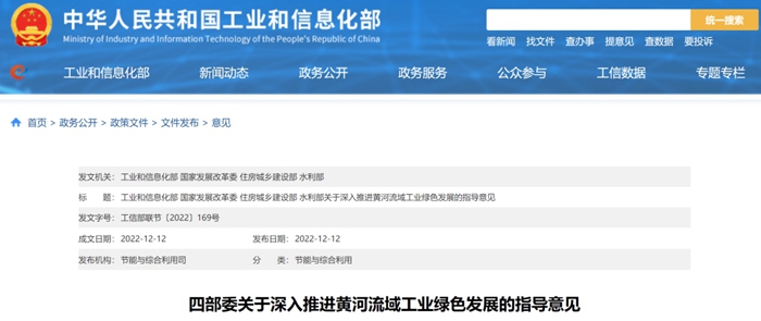 12月12日,工業(yè)和信息化部、國家發(fā)展改革委、住房城鄉(xiāng)建設部、水利部四部門聯(lián)合發(fā)布《關于深入推進黃河流域工業(yè)綠色發(fā)展的指導意見》,以下簡稱《意見》。