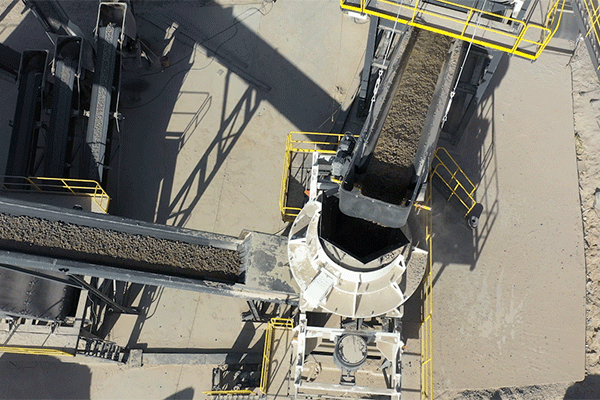 10-100mm的物料經皮帶輸送機輸送到中碎圓錐破碎后,由皮帶輸送機輸送到振動篩進行篩分,篩分后,>31.5mm的物料進入細碎圓錐進行破碎。