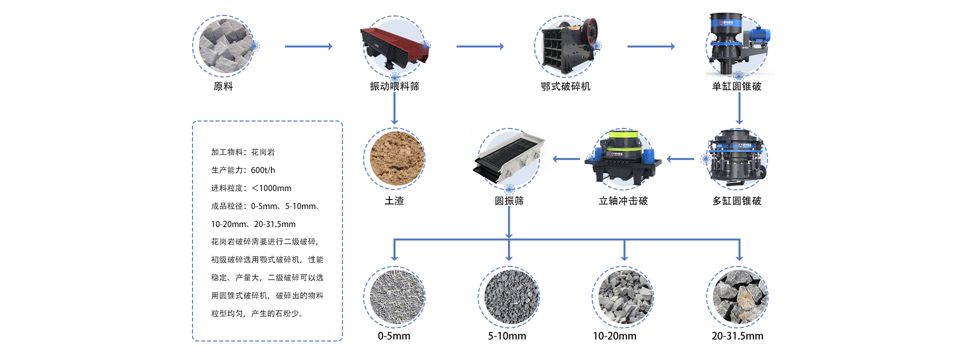 花崗巖破碎需要進(jìn)行二級(jí)破碎,初級(jí)破碎選用顎式破碎機(jī),性能穩(wěn)定,產(chǎn)量大,二級(jí)破碎可以選用圓錐式破碎機(jī),破碎出的物料粒型均勻,產(chǎn)生的石粉少。